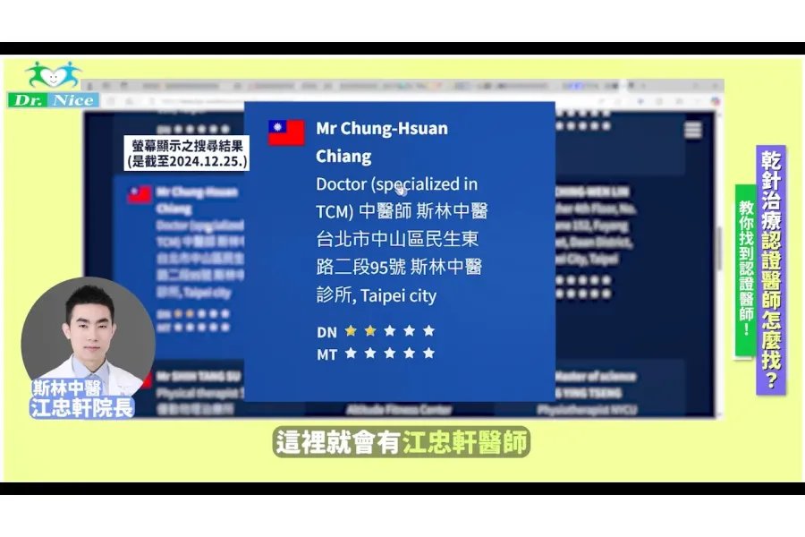Dr.Nice江忠軒中醫師,江醫師是台灣最早登錄在乾針官方網頁的醫師之一,今天手把手教大家,在台灣如何找到乾針認證醫師,最詳細的說明,大家不要錯過喔!